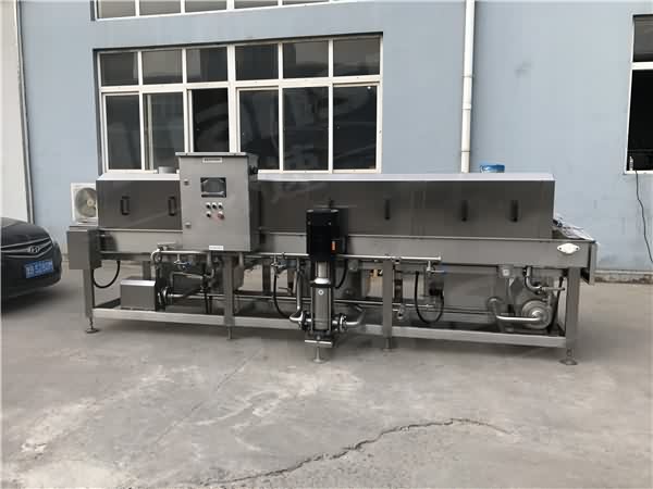 超聲波塑料筐清洗機(jī)主要依據(jù)設(shè)備應(yīng)用的范圍,應(yīng)用于食品或容器具的清洗和消毒設(shè)備 食品、容器具等待清洗器具從周轉(zhuǎn)箱清洗機(jī)輸入端進(jìn)入清洗隧道,經(jīng)過預(yù)洗、主清洗、漂洗、清水凈洗最后輸出,完成清洗過程。周轉(zhuǎn)箱清洗機(jī)輸送系統(tǒng)采用變頻調(diào)速電機(jī)帶動,調(diào)節(jié)電機(jī)速度以控制清洗時間。該機(jī)側(cè)導(dǎo)向機(jī)構(gòu)可調(diào)以,適應(yīng)不同規(guī)格清洗物品。