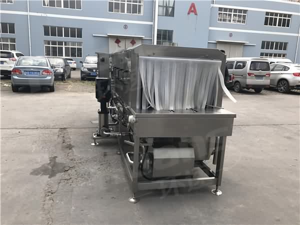 大型塑料筐清洗機實際工作時,傳動鏈帶動筐體依次通過機架上的進筐端、熱水清洗段、毛刷清洗段、高壓清洗段、自來水清洗段、最后通過出筐端出來,其中熱水清洗段、熱水清洗段、自來水清洗段提供清洗液體至噴淋管,噴淋管包括上下噴淋管和左右噴淋管,增加了筐體噴射面積,清洗比較全面、透徹,毛刷清洗裝置包括上下毛刷和左右毛刷,進一步對筐體的透徹清洗,避免在筐體的死角遺留污漬,天津洗箱機水箱包括第一水箱和第二水箱,筐體先通過第一水箱內的熱水進行消毒,然后通過第二水箱的熱水進一步的清洗,結構比較合理。本結構下毛刷采用兩個,左右毛刷設在兩個下毛刷之間,結構比較緊湊,設計合理,本結構每個噴淋管上均設有若干個噴頭,進一步全面、透徹的對筐體進行清洗,手輪用于調節噴淋管的高度,便于清洗、操作,塑料筐清洗機操作能比較透徹、全面的清洗,工作效率高,減小了勞動強度,而且比較省時。