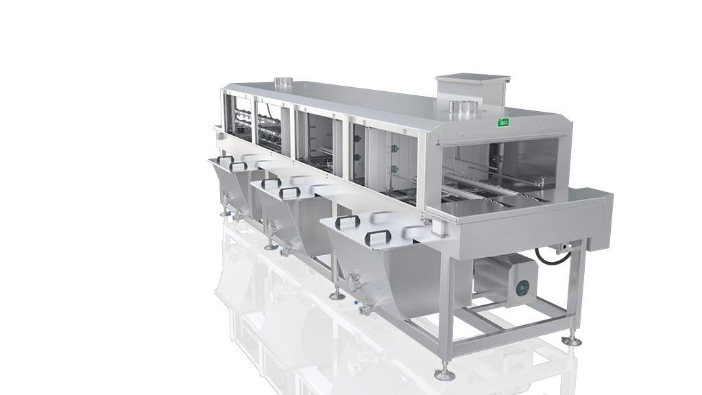 風干型洗筐機以高壓噴淋沖洗為主要清洗方式,以約80℃熱水為主要清洗力進行清洗;各個循環水箱均采用臥式不銹鋼離心水泵循環噴淋,從上、下、左、右四個方向同時對筐子進行噴淋沖洗;每個水箱均設有二道過濾裝置,便于隨時清理贓物;各個水箱設單獨排污清理閥,排出后有截管同一排放。設備有高壓噴淋段、熱水噴淋段、清水噴淋段、烘干段幾部分組成,其中消毒水噴淋段及烘干段可根據客戶要求定配。