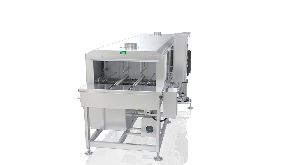 帶烘干洗筐機(jī)將噴水清洗機(jī)構(gòu)與毛刷清洗機(jī)構(gòu)交替布置清洗,能更加有效清洗筐體內(nèi)污漬,并通過(guò)高溫烘干裝置,消毒烘干,進(jìn)一步保證其衛(wèi)生質(zhì)量,不僅清洗效率高,而且清洗質(zhì)量好。