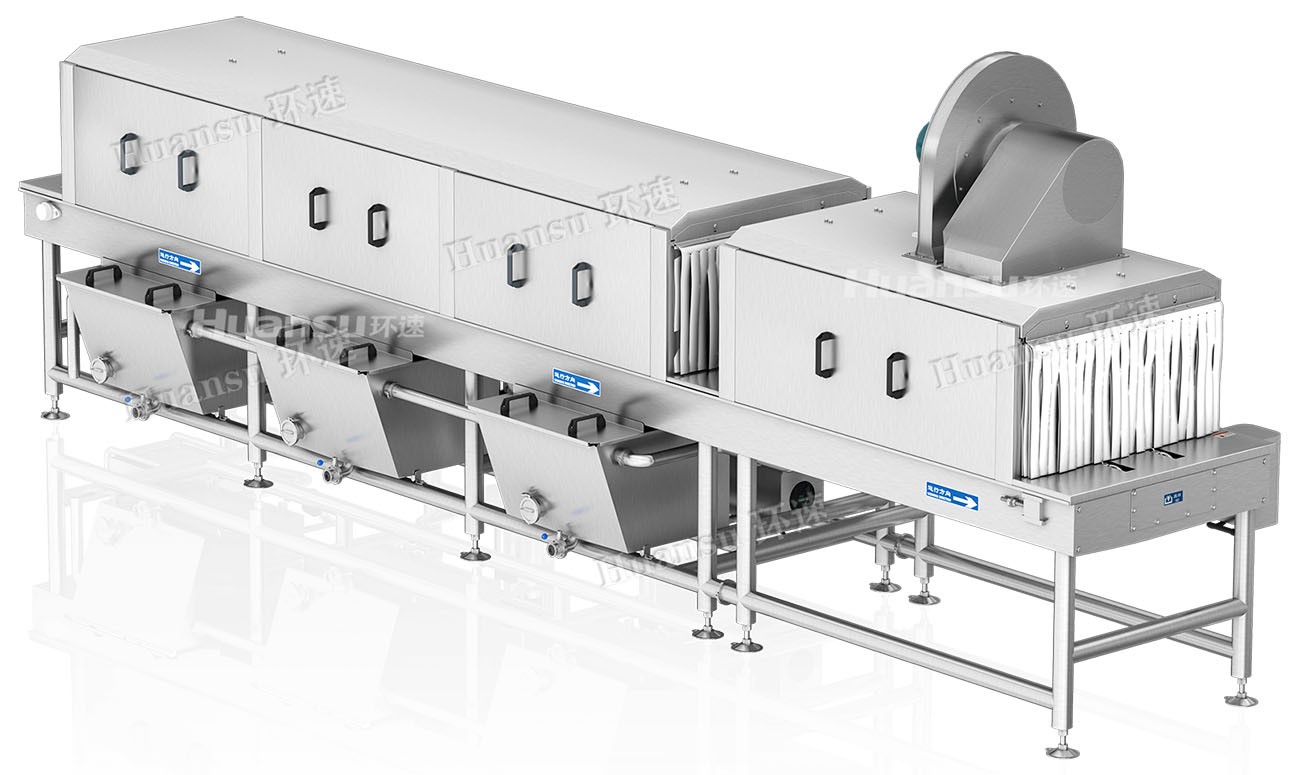 使用三級水箱與四級清洗方式將容器的附著物清洗干凈。首先采用大流量清洗,模擬浸泡法將附著物泡脹泡軟,更利于后續清洗干凈。第二級采用高壓清洗,將附著物通過高壓的方式將其沖離開容器表面。第三級采用凈水漂洗,通過使用較為干凈的水將前兩級殘留的清洗液清洗干凈。第四季采用凈水沖洗,使用沒經過循環的干凈水將殘留污水全部沖洗干凈,同時也起到了對高溫清洗后的筐子進行降溫的作用。與其他塑料筐清洗機不同的是,環速研發的周轉筐清洗機可加裝風干或烘干系統,進一步提高容器周轉效率。