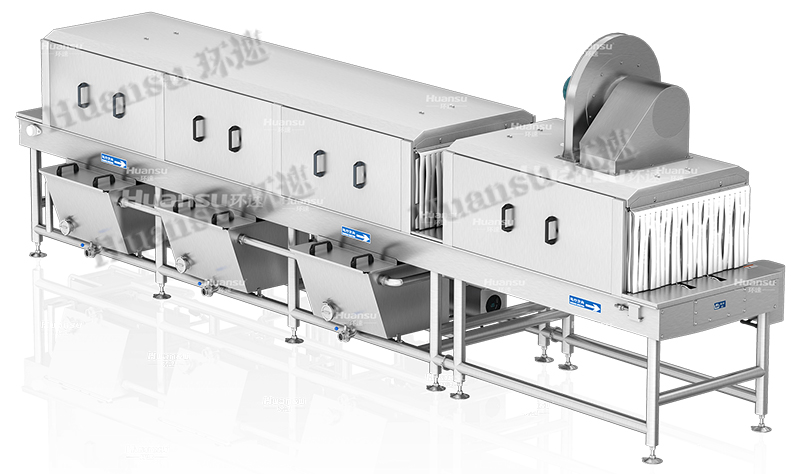 環(huán)速研發(fā)人員在經(jīng)過多次去往國外學(xué)習(xí)后研發(fā)了一款可以對周轉(zhuǎn)筐清洗的周轉(zhuǎn)筐清洗機,通過90℃以上的高溫水對盛放海鮮的周轉(zhuǎn)筐進行高溫清洗,同時使用高壓清洗方式對上面的污漬進行沖洗,以此來保證容器上的污漬可以得到有效去除。在清洗的過程中,無需添加任何清洗劑,因此不會產(chǎn)生清洗劑采購與污水排放的成本。除此之外,環(huán)速研發(fā)的這款容器滅菌清洗機可加裝風(fēng)干與烘干系統(tǒng),在容器清洗后,可通過風(fēng)干系統(tǒng)吹干容器表面水分,而通過高溫烘干系統(tǒng)可去除容器殘留水分,并通過高溫繼續(xù)對容器進行滅菌處理,來保證容器可以得到有效滅菌。