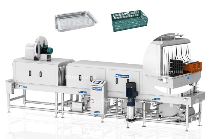 環(huán)速科技的這類設備能夠同時清洗筐類容器和盤類容器,并且在清洗時無需洗滌劑,也可以對筐盤類容器起到滅菌的效果。設備設計了筐類產(chǎn)品清洗通道和盤類產(chǎn)品清洗通道,可以同時清洗這兩類容器。