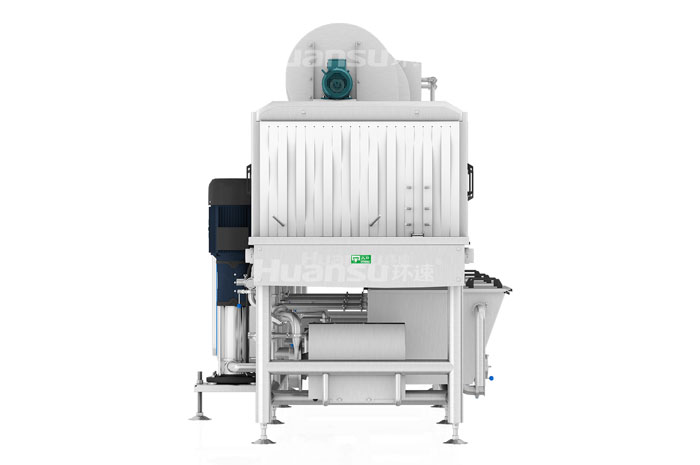 其通過使用高溫(可按需設置)高壓水進行四級清洗,將筐盤容器上的雜質(zhì)一步步剝離,清洗干凈容器,并進行巴氏滅菌,實現(xiàn)容器的快速周轉(zhuǎn)。此外,環(huán)速科技的筐盤滅菌清洗機實現(xiàn)了水的循環(huán)利用,在四級清洗對應的三級水箱中,三級水箱水量增加后溢入二級水箱,二級水箱的清洗水溢入第一級水箱,第一級水箱的清洗水溢入下水道,通過這三級水的循環(huán)利用,始終保持后位水箱中的水總是比前一級水箱干凈,形成水循環(huán),減少設備工作過程中的用水量,節(jié)省成本。在清洗結(jié)束后,部分設備型號還配備了風干和烘干步驟,通過風刀將筐盤容器中殘留的水滴吹落,實現(xiàn)節(jié)能、高質(zhì)量的除水功能。