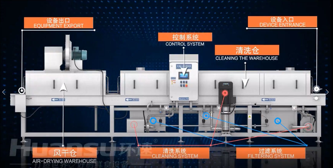 環速食品周轉筐清洗機使用巴氏滅菌方式,有四級清洗,通過這四級清洗可以將周轉筐表面的食品殘渣、油脂、附著物等雜質清洗干凈,并且不需要添加洗滌劑,沒有排放污水的困擾。在四級清洗過程中,各清洗階段相互配合,分別有泡軟污漬、沖洗污漬、沖洗干凈污漬碎屑、清水凈洗的功能,經過環速食品周轉筐清洗機處理的筐子潔凈度更高,使用于眾多食品企業的周轉筐清洗。