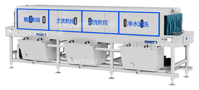 環速洗箱機,為了確保洗得干凈,特別設計了四步快速清洗的流程,總共對筐盤進行四個階段的殺菌去污操作。在前三個階段,它采用高溫高壓噴淋的方式,對容器進行全方位的清洗和殺菌操作。隧道內的噴頭采用環繞式布局,第一階段的底部三排噴頭還可以大角度左右搖擺,確保容器內外與水充分接觸,清洗不留盲點。清洗水的供應來自多功能水箱,它集成有加熱、測溫、控溫的功能,可利用熱蒸汽快速將水加熱并保持在指定的溫度,確保滅菌的質量。