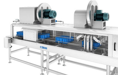 后筐盤雖然已經煥然一新,但仍然有水分殘留在表面,在寒天的天氣里仍然會迅速結冰,不利于直接使用;如果是在氣溫高的夏季則更為致命,容器將更容易沾染灰塵與細菌,造成二次污染,再度成為病菌繁殖的溫床。因此,清洗后的除水也是至關重要的。環速洗箱機配備有風干和烘干兩種方案,客戶可根據需要自行選擇。值得一提的是,風干機中應用了環速自主研發的風刀裝置,可將壓縮機產生的空氣轉化為薄薄的高速氣流,以很小的流量就能去除水分。假如客?對容器的干燥度還有更高的要求,可以同時選配風干、烘干功能,甚至加裝多組風干烘干模塊,確保容器的除水率合乎標準。