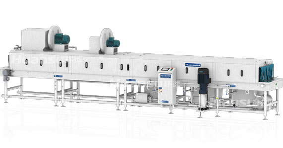 盡管滅菌清洗的效果已經很理想,但煥然一新的筐盤仍不能直接使用,這是由于其表面還殘留不少水分,無法直接用來盛放食品,然而集中堆垛存儲又不利于水分蒸發,況且悶濕狀態更容易滋生細菌,造成二級污染。為了解決該問題,設備清洗段的后方配有容器風干機和烘干機,二者都搭載了環速自主研發的風刀裝置,可以產生高壓氣流,能將筐盤內外表面的水分快速吹干,真正做到隨洗隨用,提高容器周轉率,減少倉儲成本。