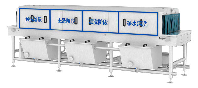 本期我們就以隧道式清洗機為例,介紹一下自動洗筐的過程與原理。隧道式清洗機,采用高溫高壓噴淋的方式,對容器進行全方位無死角的沖刷,去除頑固污漬、滅殺多種細菌。為了保證清洗的效果,隧道式清洗機設計了四步快速清洗搭配三級水箱供水的方案。四步快速清洗,是指將整個容器清洗流程分為四個階段:預洗、主洗、漂洗、凈洗;三級水箱系統,針對四步清洗流程而設計,各級水箱分別對應一個清洗環節。兩套系統的默契配合,確保了筐盤清洗的效果。