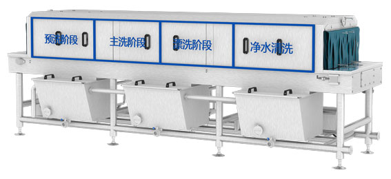 環(huán)速容器滅菌清洗機(jī),是一款多功能的容器清洗設(shè)備,具有清洗、滅菌、除水的功能,流程自動(dòng)化,無須人工參與。設(shè)備整體采用隧道式設(shè)計(jì),劃分出了清洗段與除水段。清洗段又分為預(yù)洗、主洗、漂洗、凈洗四個(gè)環(huán)節(jié),分別負(fù)責(zé)不同的清洗職能。預(yù)洗利用大流量噴淋模擬浸泡的效果,用于軟化頑固污染,同時(shí)能夠去除淺表性的油污、泥土及霉斑;主洗利用高壓,負(fù)責(zé)去除泡軟后的污垢和病菌微生物;漂洗起到的是高溫漂燙的作用,能夠去除零星的殘留物;凈洗是常溫噴淋,目的是使容器恢復(fù)潔凈,并完成降溫。