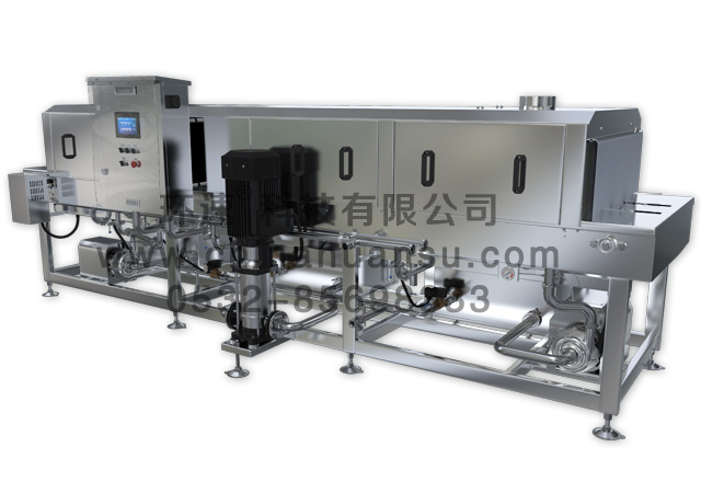 自動洗箱機預洗過程是水泵將水從預洗水箱中吸出,經噴嘴噴出,使食品或容器具各面收到清洗,洗掉雜物,清洗后的污水經過濾分離流回水箱,雜物排出。無菌洗箱機主清洗過程是水泵將溫水從主清洗水箱中吸出,經噴嘴噴出,使食品或容器具各面受到清洗,清洗掉剩余雜物及油污,清洗后的污水經過濾分離流回水箱,雜物排出。漂清過程是漂洗水泵將熱水從漂洗水箱中吸出,經噴嘴噴出,將被清洗物上的清洗劑等漂洗掉,同時對清洗物進行消毒,水流至主清洗水箱。周轉箱清洗機輸送系統采用變頻調速電機帶動,調節電機速度以控制清洗時間。該機側導向機構可調以,適應不同規格清洗物品。